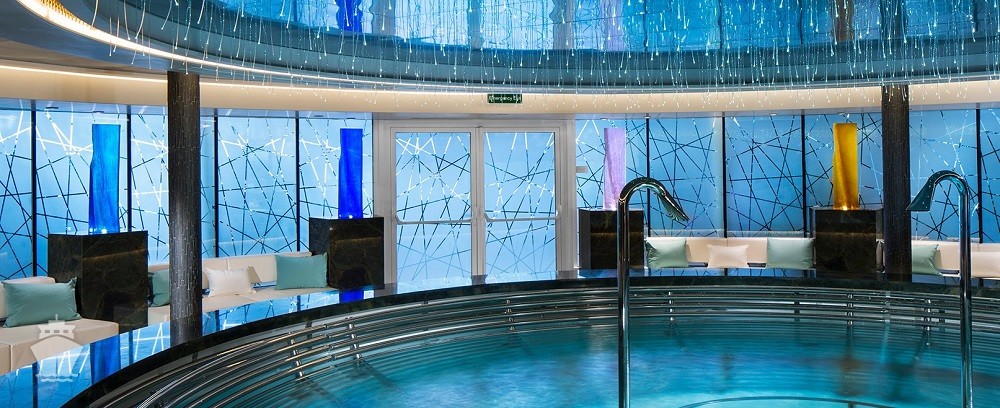 ![]() | Pinnacle Suite PS 126 m² vrátane verandy Veranda s teakovou podlahou 3. lôžko; veľká obývacia časť; 2 umývadlá, vírivá vaňa a extra sprcha; vlastný stereo systém; mikrovlnka a mraznička; veranda s vírivou vaňou. | ![]() |