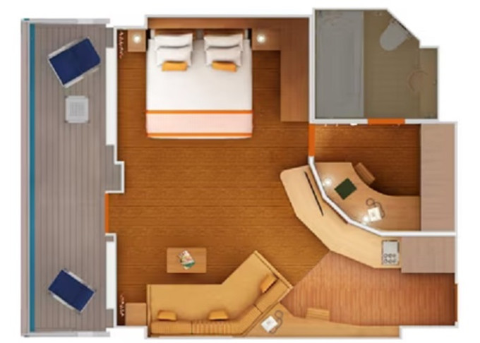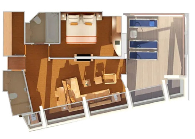 | 8S - Kajuta s balkónom Cloud 9 Spa 17 m² + balkón 3 m². 10. paluba vpredu. Voľný vstup do Spa a balíček Cloud 9 Spa. | 1 798 € 899 € za osobu |