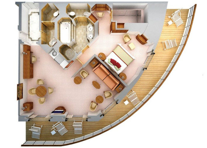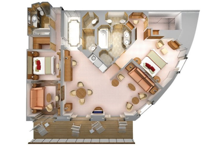 | R2 - Royal Suite 2 127 m² (vrátane 18 m² balkónov). Royal Suite prepojená s Veranda Suite. 7. paluba vpredu. Max 5 osôb. | 56 800 € 14 200 € za osobu |