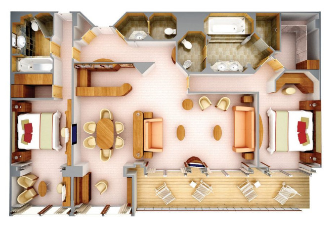 | R2 - Royal Suite 2 127 m² (vrátane 18 m² balkónov). Royal Suite prepojená s Veranda Suite. 7. paluba vpredu. Max 5 osôb. | 42 600 € 14 200 € za osobu |