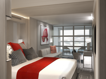 - Kajuty sú umiestnené v blízkosti lodného Spa. K ich vybaveniu patrí posilnený systém vzdušnej filtrácie, posteľ Queen-Size (v kategóriách Edge King-Size), veľké zasúvacie sklenené dvere, exkluzívne posteľné prádlo eXhale®, veľkorysé skladovacie priestory.