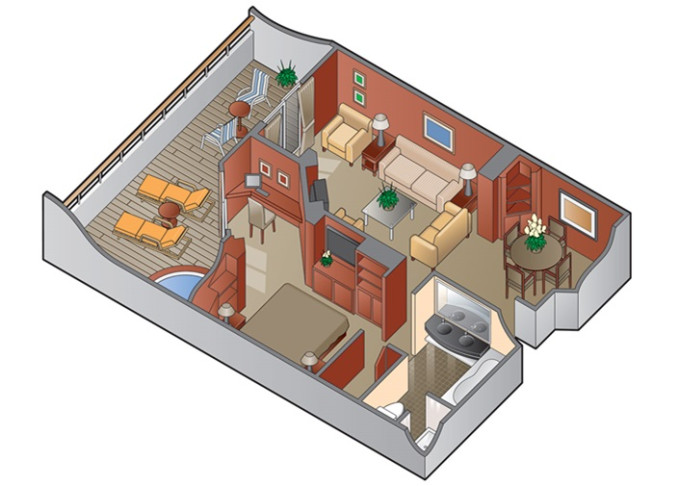 CS - Celebrity Suite 43 m² + balkón 8 m². Vírivka. 6. až 9. paluba. Max 3 osoby. Výhody Suite. Vstupná hala, spálňa s TV, šatník, kúpeľňa s vaňou a sprchou, obývačka, media center, 52-inch TV so surround sound. 9 568 € 2 392 € za osobu