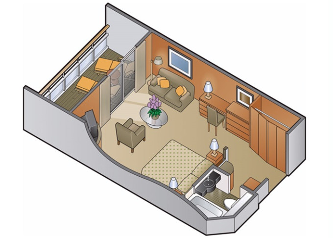 CS - Celebrity Suite 43 m² + balkón 8 m². Vírivka. 6. až 9. paluba. Max 3 osoby. Výhody Suite. Vstupná hala, spálňa s TV, šatník, kúpeľňa s vaňou a sprchou, obývačka, media center, 52-inch TV so surround sound. 8 493 € 2 831 € za osobu
