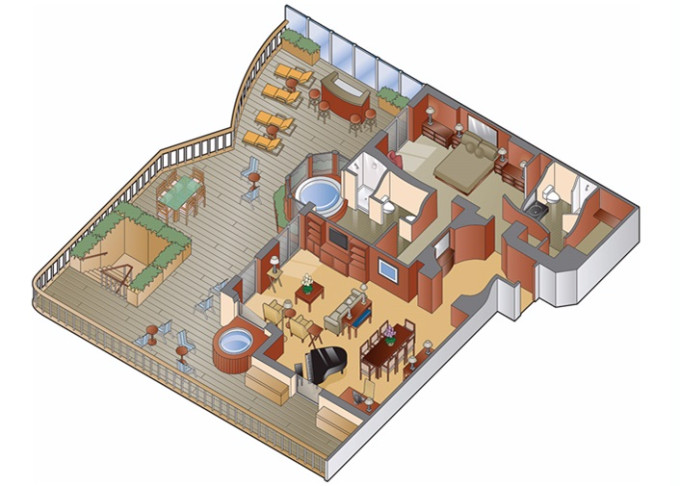 CS - Celebrity Suite 43 m² + balkón 8 m². Vírivka. 6. až 9. paluba. Max 3 osoby. Výhody Suite. Vstupná hala, spálňa s TV, šatník, kúpeľňa s vaňou a sprchou, obývačka, media center, 52-inch TV so surround sound. 7 276 € 7 276 € za osobu