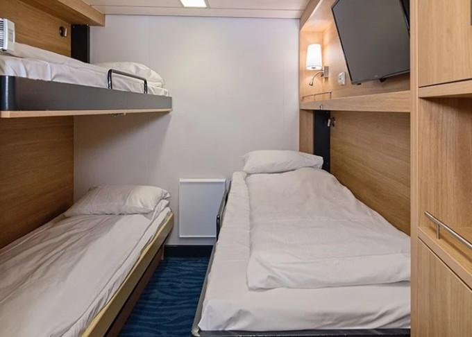 | K3 - Vnútorná kajuta Polar 8-9 m². Tv. Horná paluba. Max 3 osoby. | 3 346 € 1 673 € za osobu | ||