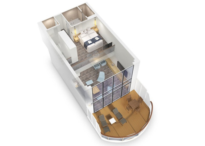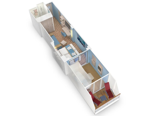 | DA - Kajuta s verandou Deluxe PREMIUM 21 m² + balkón 11 m². 9. až 14. paluba. Max 3 osoby. Cenový model Premium. | 3 490 € 1 745 € za osobu | ||