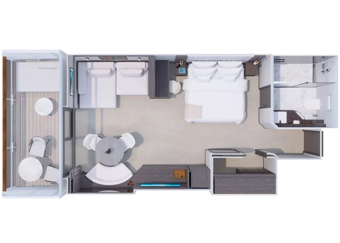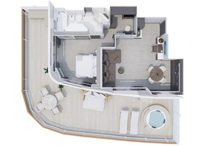 | Serenity Residence Suita 60 m² + Terasa s vírivkou, sedením, pohovkou a lehátkami 7. paluba: 53 m² / 9. paluba: 66 m². Spálňa s obývacou a jedálenskou časťou, šatník. Koktailová súprava, minibar, kávovar, vodná kanvica, ďalekohľad, sejf, mramorová kúpeľňa s vaňou a sprchou. Taška Technogym Case Kit a Technogym Bench. Fľaša šampanského na privítanie. Služby osobného majordóma. Max kapacita 3 dospelí alebo 2 dospelí + 2 deti pod 18 rokov. | 72 249 € 24 083 € za osobu |