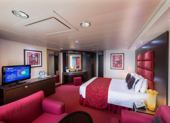Suite s balkónom/panoramatickým oknom: cca32m²(Royal suite: 52m², Family suite: 45-53m², Deluxe Suite: 32-39m², Aurea suite: 21-47m²), kajuta s manželskou posteľou (na požiadanie 2 oddelené postele) a rozkladacia pohovka. Klimatizácia, kúpeľňa s vaňou, toaletný stolík, priestorná skriňa, interaktívna TV, telefón, minibar, sejf, sušič na vlasy. Balkón so stolíkom a stoličkami/panoramatickým oknom. Internetové pripojenie (za poplatok).