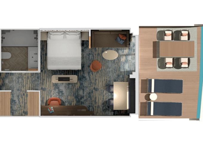 | HU - Suite Havana Cabana Corner 33 m² + vonkajšie rohové patio 15 m². 8. paluba vpredu. Max 3 osoby. Tropický štýl, vstup do exkluzívnej zóny Havana. Výhody Suite. | 5 640 € 2 820 € za osobu | ||