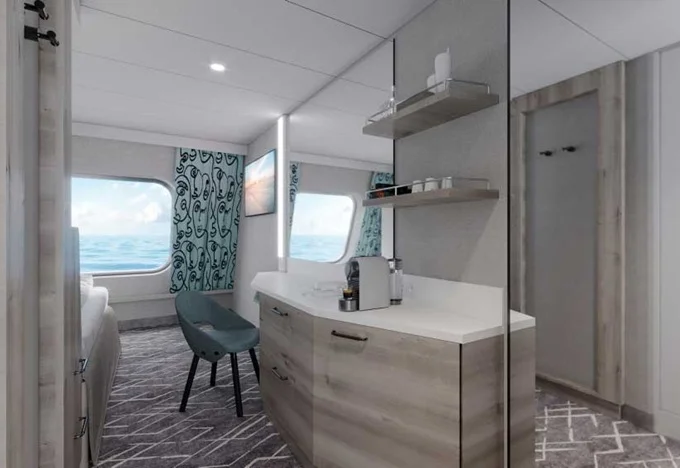 SKAO - Schöne Aussicht Suite 39 m² + balkón 10-12 m² s ležadlami a hojdacou sieťou. 7-14. paluba. Max 4 osoby. Výhody Suite. 9 898 € 4 949 € za osobu